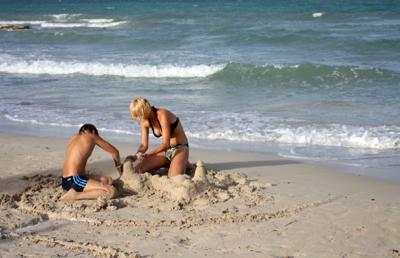In the photo you can see my son and wife building the sand castle with the sea in the background.